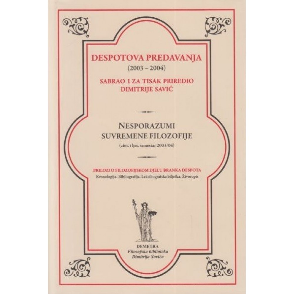 Sabrana predavanja ovog uglednog profesora koja su održana na Katedri za povijest filozofije na Filozofskom fakultetu u Zagrebu u zimskom i ljetnom semestru ak. god. 2003/4. Riječ je o 23 predavanja pod nazivom "Nesporazumi suvremene filozofije", a osim filozofa poput Kanta, Nietzschea, Sartrea i drugih, Despot u ovaj filozofski dijalog uvlači i brojne umjetnike, znanstvenike i povijesne ličnosti poput Kafke, Kandinskog, Šenoe, Napoleona, Darwina i mnogih drugih. Na kraju knjige su Prilozi o filozofijskom djelu Branka Despota.