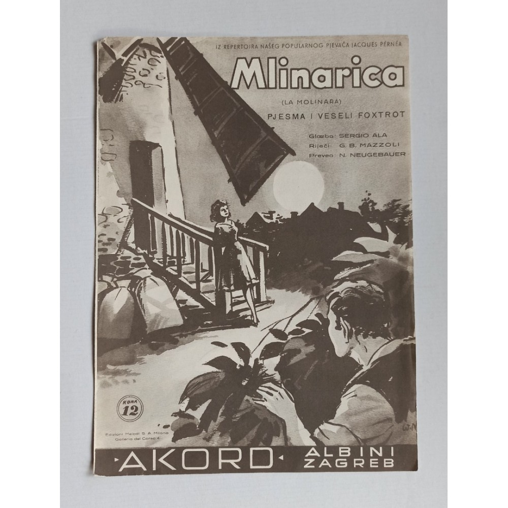Glazba Sergio Ala, Riječi G. B. Mazzoli, Prijevod N. NeugebauerMlinarica (La molinara) - Pjesma i veseli foxtrot - Vokalna partituraIz repertoara našeg popularnog pjevača Jacques Pérnéa