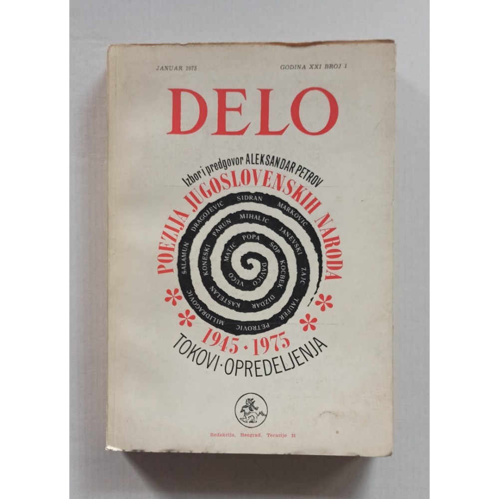 Časopis Delo, januar 1975, godina XXI, broj 1Poezija jugoslavenskih naroda 1945.-1975. - Tokovi i opredeljenja - Izbor i predgovor: Aleksandar Petrov