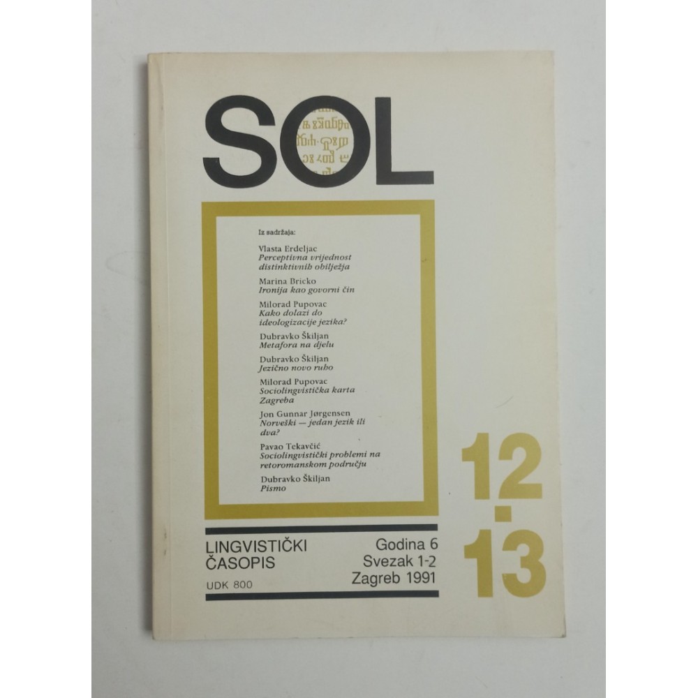 Glavni urednik Milorad PupovacSOL - Lingvistički časopis 1991 - Godina 6, Svezak 1-2, 12-13Vlasta Erdeljac - perciptivna vrijednost distinktivnih obilježjaDubravko Škiljan - Metafora na djelu
